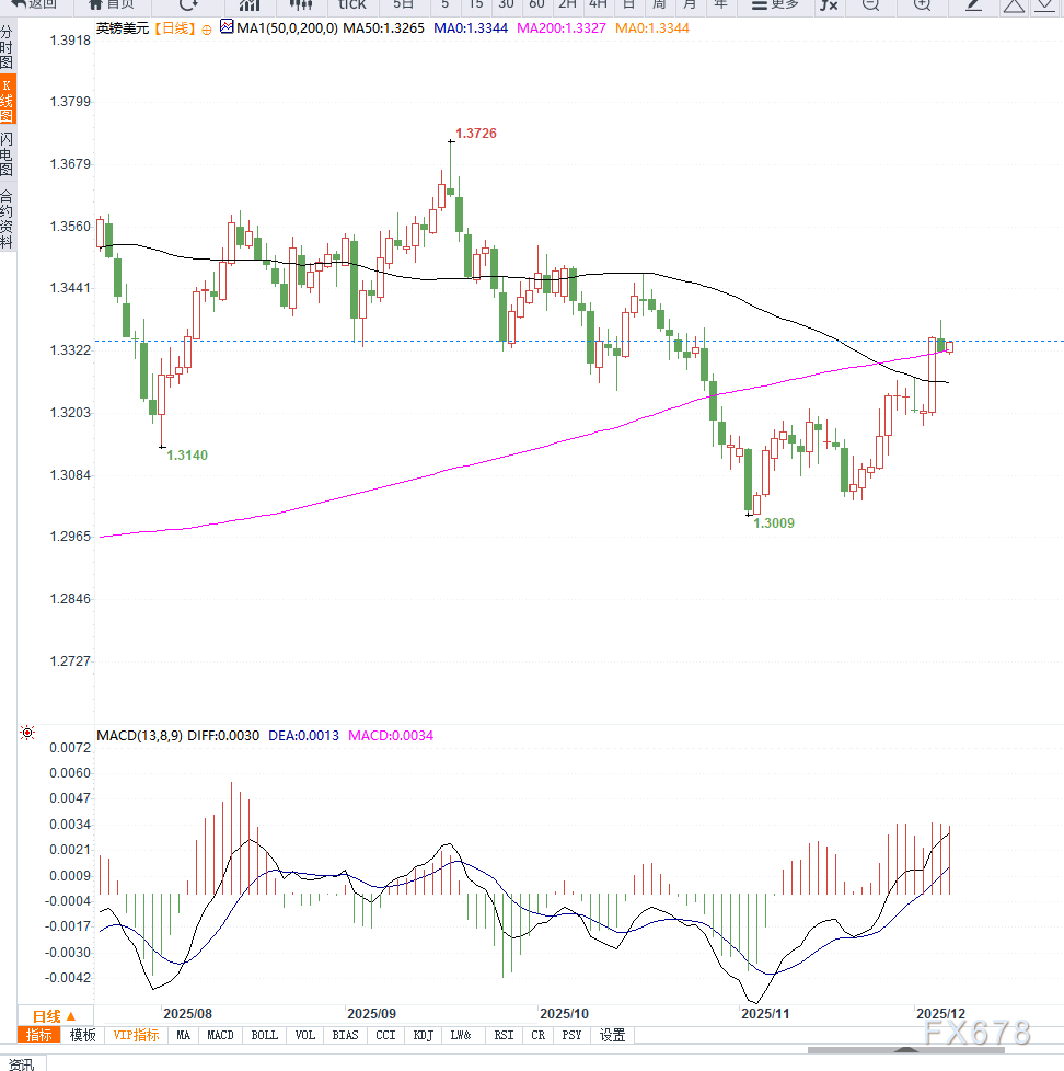 汇价接近布林带上轨(1.3348),布带扩张显示波动率上升和多头压力增强。