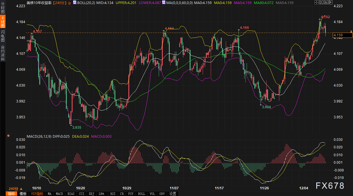 汇通财经APP讯——周二(12月9日),金融市场在美联储年末政策会议前夕表现敏感。美元指数日内微跌0.04%,报99.0719,继续横向整理,显示投资者在政策明朗前保持谨慎。10年期美债收益率报4.159%,日内小幅走低0.29%,但近两周累计上升近17个基点,表明市场正在消化美联储可能释放的信号。现货黄金上涨0.34%,报4204.52,在债市波动中呈现避险买盘。早盘美债成交温和,10年期合约成交28.5万手,曲线因欧洲债市反弹而趋平。欧美股市表现平淡,凸显当前债市动向对汇率与贵金属市场的传导效应。